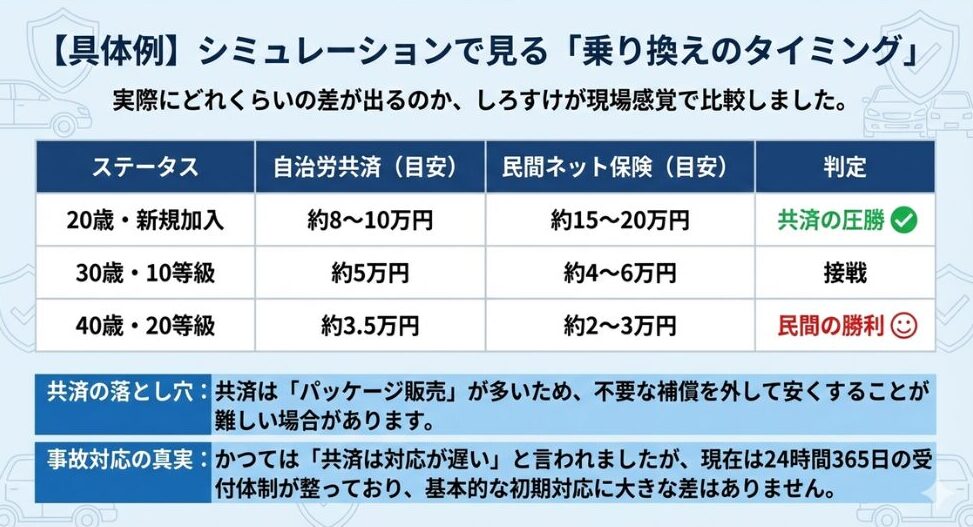 • 結論: 20代の若手や等級が低い間は「自治労共済」が圧倒的に強いですが、20等級に近いベテランなら「民間のダイレクト型(ネット保険)」の方が安くなる逆転現象が起きます。