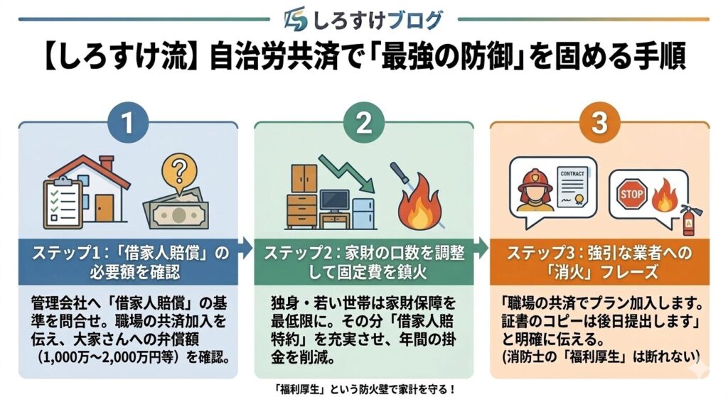 不動産屋の「高い保険」を消火し、自治労共済に乗り換える具体的な3ステップです。