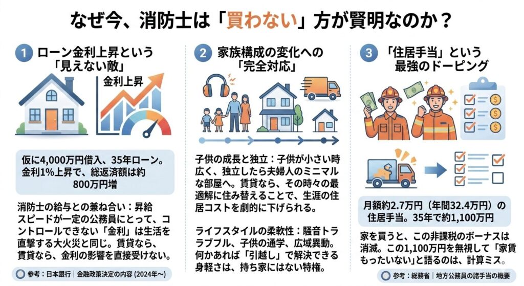 - 消防士の給与との兼ね合い: 昇給スピードが一定の公務員にとって、コントロールできない「金利」という固定費の上昇は、生活を直撃する大火災と同じです。賃貸なら、金利の影響を直接受けることはありません。