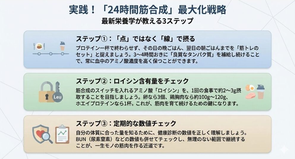最新栄養学を生活に取り入れ、賢く筋肉を育てるための3ステップです。