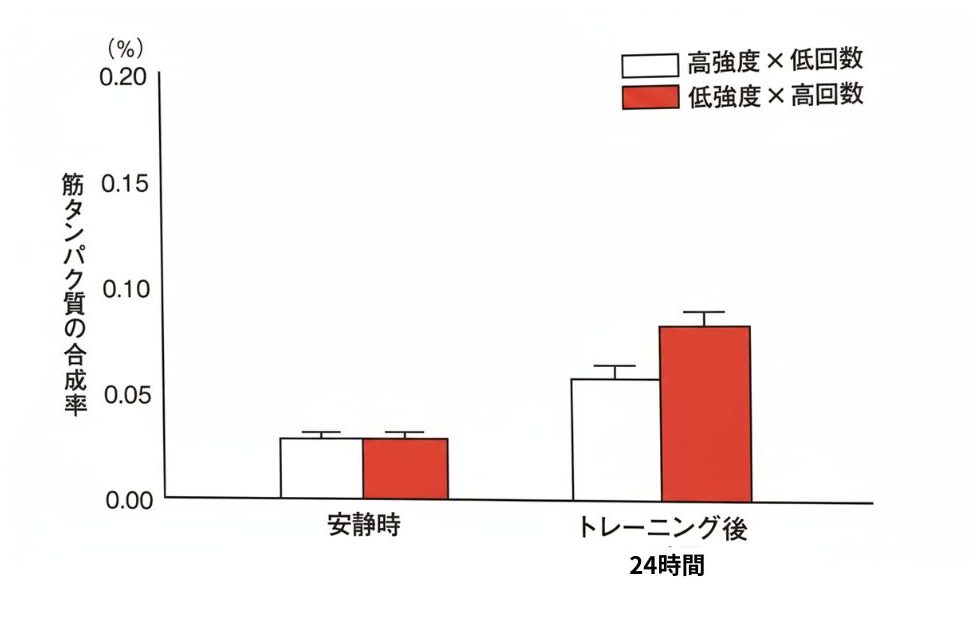 特筆すべきは、トレーニング後の筋タンパク質の合成率です。